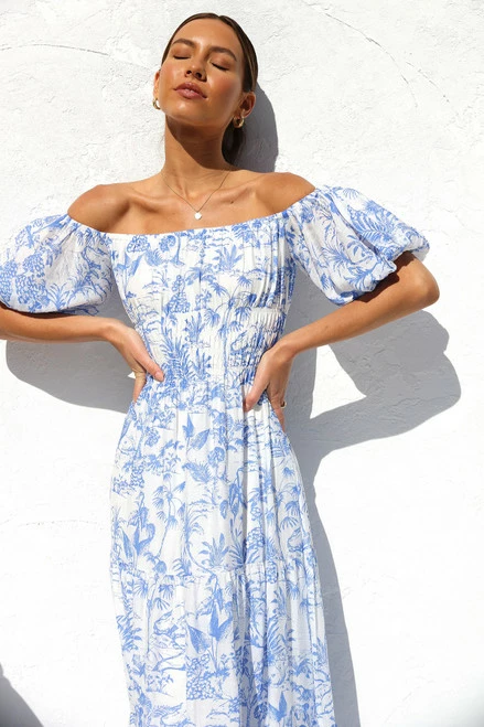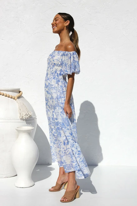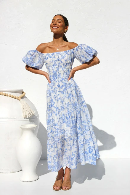 - maxi dress in blue tropical print