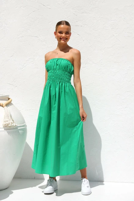 - strapless green maxi dress