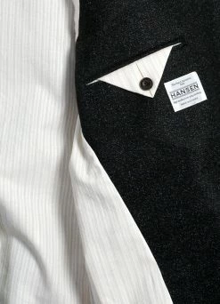 WALTER is a newcomer for AW21. The slender double breasted blazer is contemporary although it has strong references to old world clothing. It comes with a high-cut pointed lapel, flap pockets. It is fully lined with a pin-striped cotton body and viscose sleeves.